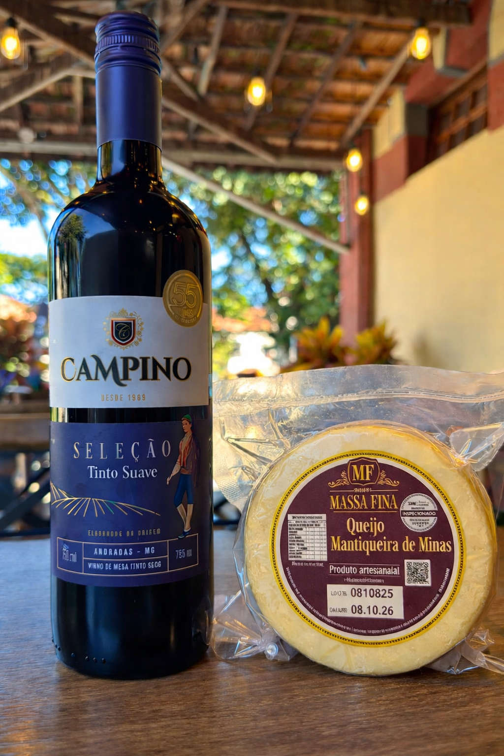 O vinho suave traz um sabor equilibrado e agradável, ideal para acompanhar queijos e petiscos, enquanto o queijo artesanal Massa Fina entrega textura macia, sabor marcante e aquele gostinho típico das fazendas mineiras.